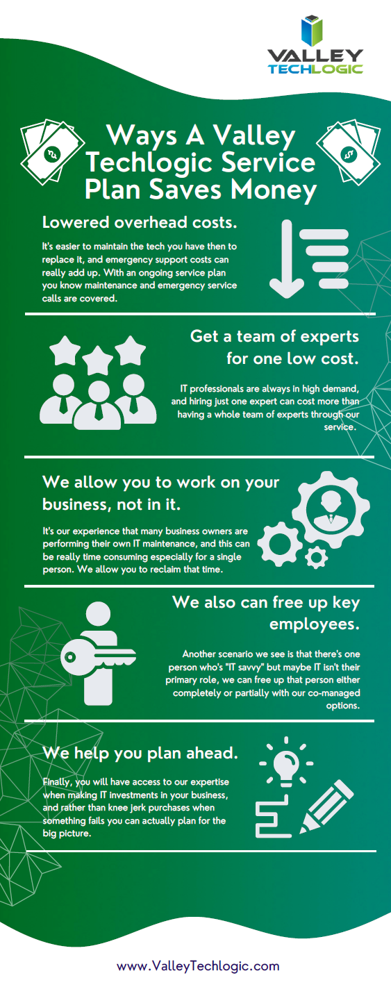 Now more than ever you need a partner in navigating the technology landscape, and Valley Techlogic can be that partner. We can help you address your technology challenges in a way that still keeps budgetary constraints in mind. We have been in business since 2004 and have experience weathering challenging times. We can even reduce your technology spending in the following ways: