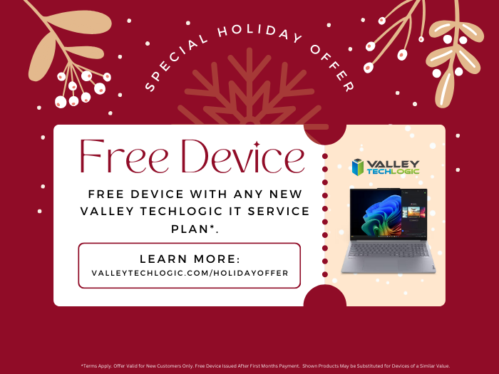 If technical outages in your business are causing service disruptions for your customer, Valley Techlogic is the solution. We prioritize maintaining our customers’ uptime so that outages don’t affect their bottom line. Reach out today to schedule a consultation and take advantage of our holiday offer going on now.