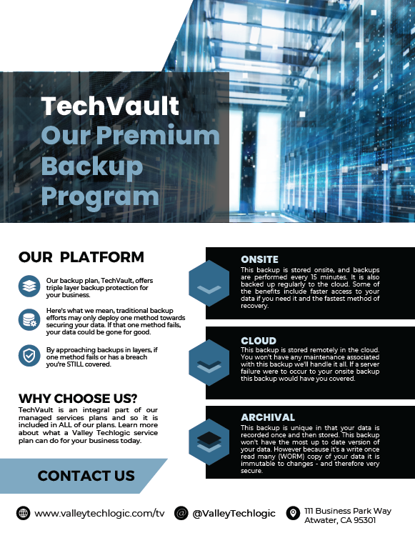 That’s why at Valley Techlogic our backup solution TechVault is available and used by each of our clients. We have this chart on the benefits of our TechVault solution.