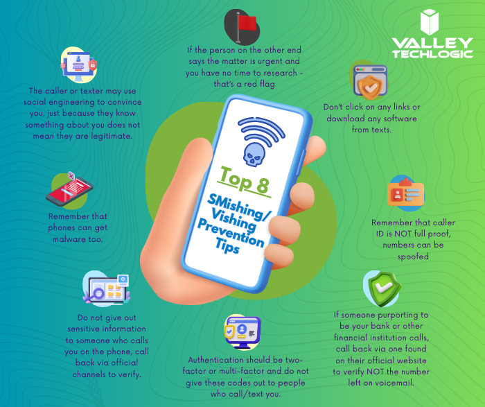 Over 90% of successful attacks have a human element to them, with this most recent attack on MGM included in that figure. Cyber security training can go a long way in preventing cyber threats to your business, but vishing may still catch you or your employees off guard. You may be wondering how someone on the phone could possibly be so convincing that you give them access to your systems or financial accounts. We made a chart on the top 8 steps you need to take to guard against a vishing(voice phishing or)’ smishing (text message phishing) attack on your business.